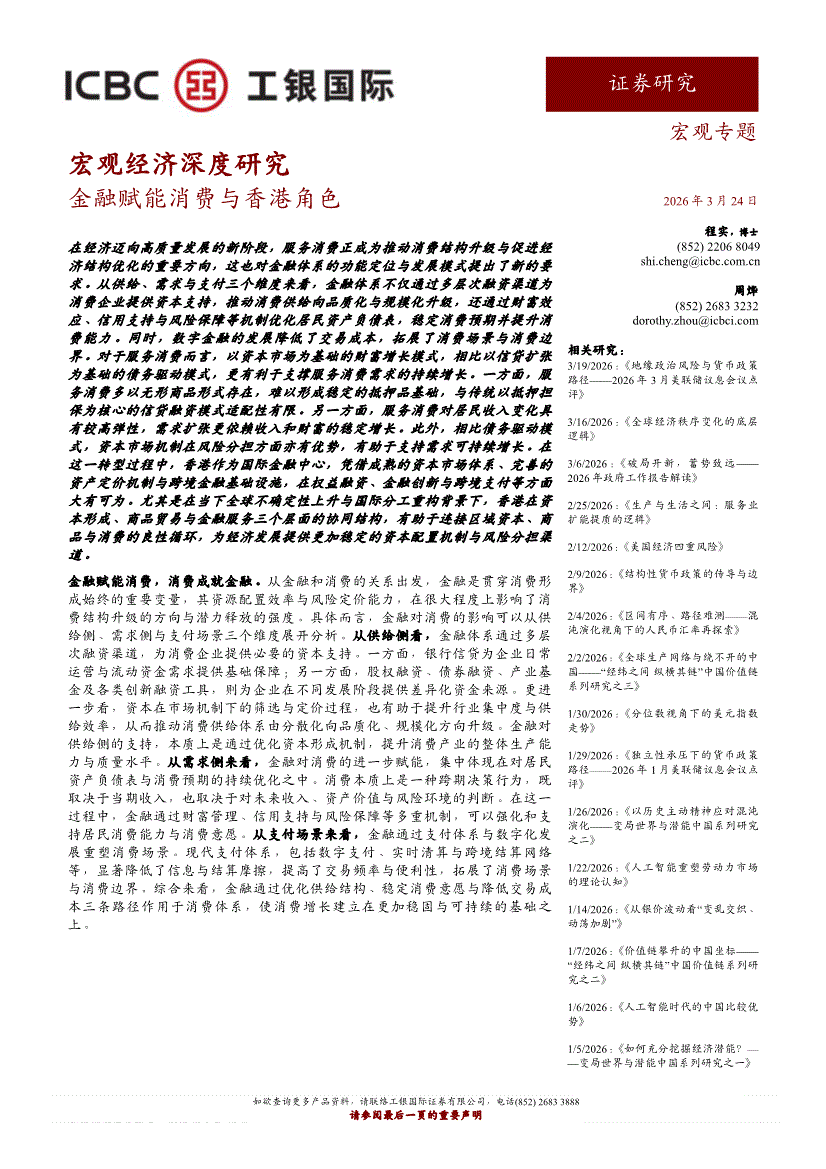 工银国际-宏观经济深度研究:金融赋能消费与香港角色-260324