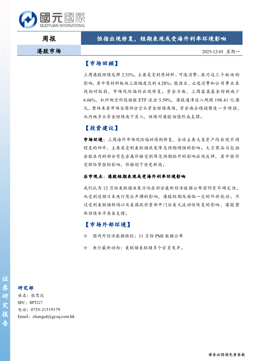 国元国际-港股市场周报:恒指出现修复,短期表现或受海外利率环境影响-251201