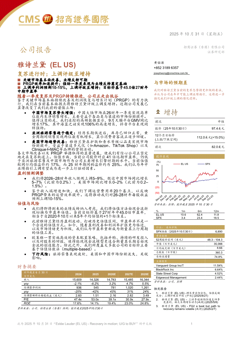 雅诗兰黛:招商证券(香港)-雅诗兰黛-EL.US-复苏进行时;上调评级至增持-251031