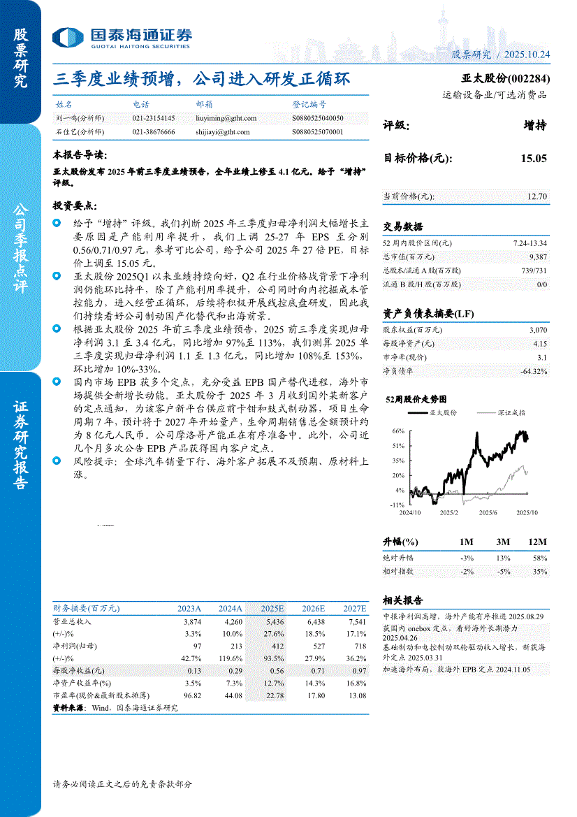 亚太股份:国泰海通证券-亚太股份-002284-三季度业绩预增,公司进入研发正循环-251024