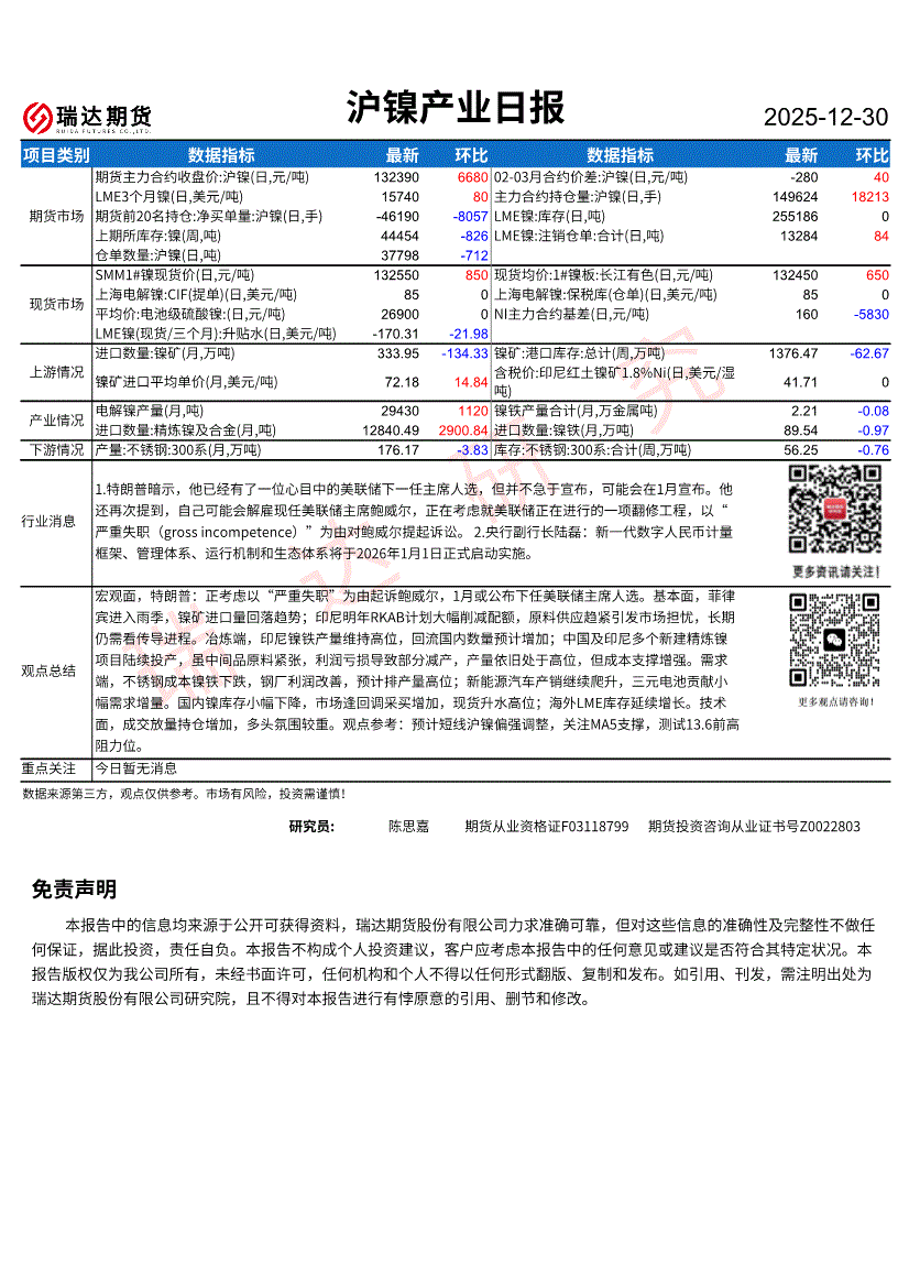 瑞达期货-沪镍产业日报-251230