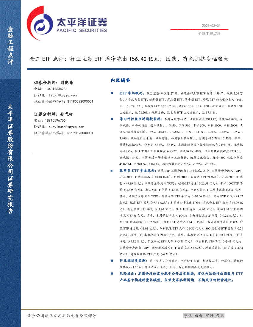 太平洋证券-金工ETF点评:行业主题ETF周净流出156.40亿元;医药、有色拥挤变幅较大-260331