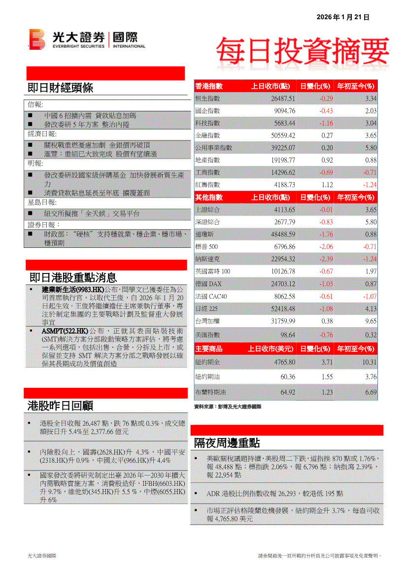光大证券(国际)-每日投资摘要-260121
