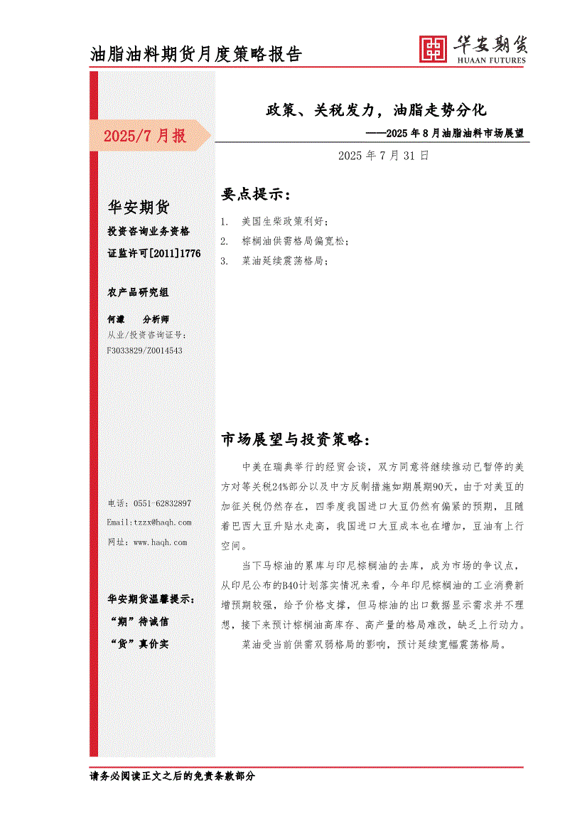 华安期货-油脂油料期货月度策略报告:2025年8月油脂油料市场展望,政策、关税发力,油脂走势分化-250731