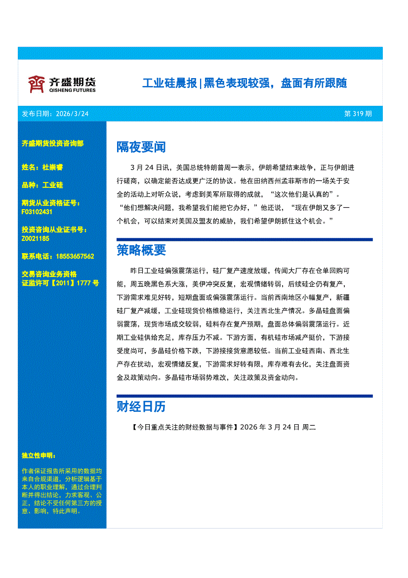 齐盛期货-工业硅晨报|黑色表现较强,盘面有所跟随-260324