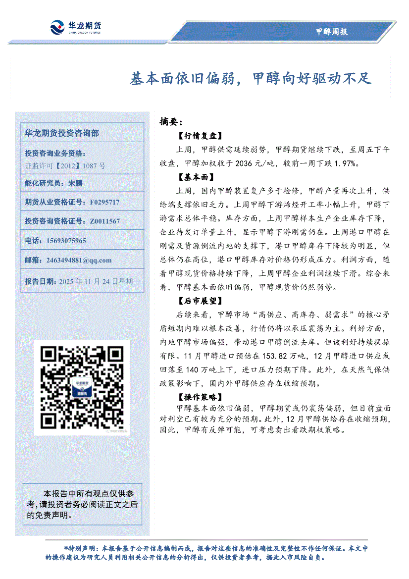 华龙期货-甲醇周报:年末需求淡季,甲醇或偏弱运行-251215