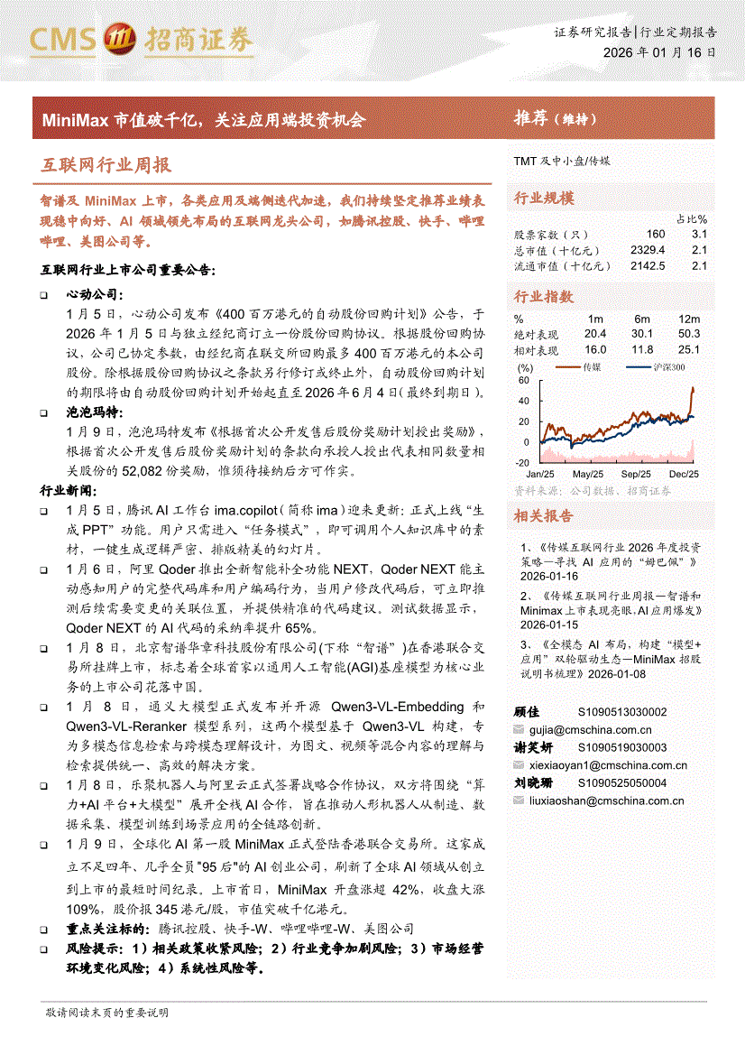 互联网行业:招商证券-互联网行业周报:MiniMax市值破千亿,关注应用端投资机会-260116