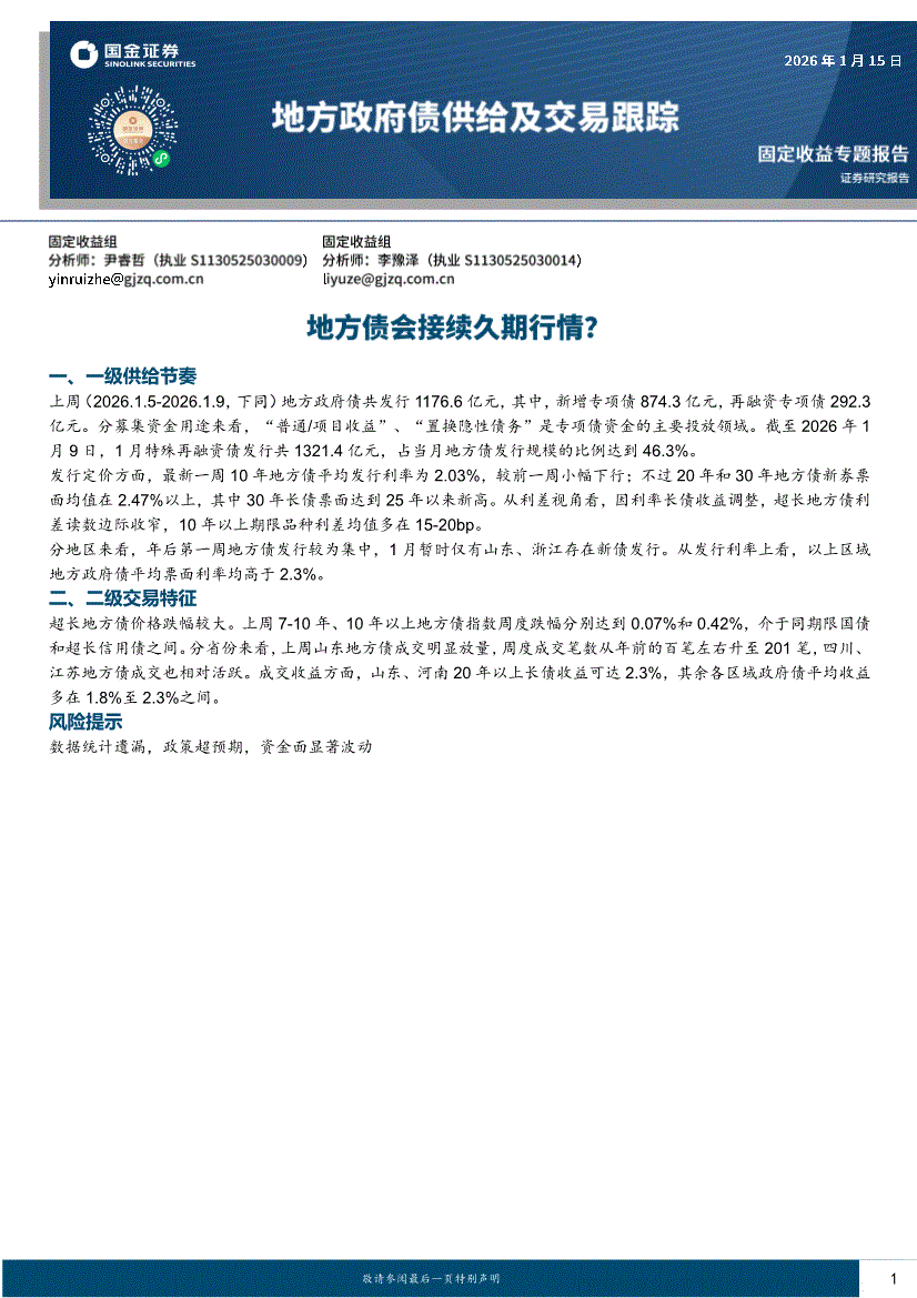 国金证券-地方政府债供给及交易跟踪:地方债会接续久期行情?-260115