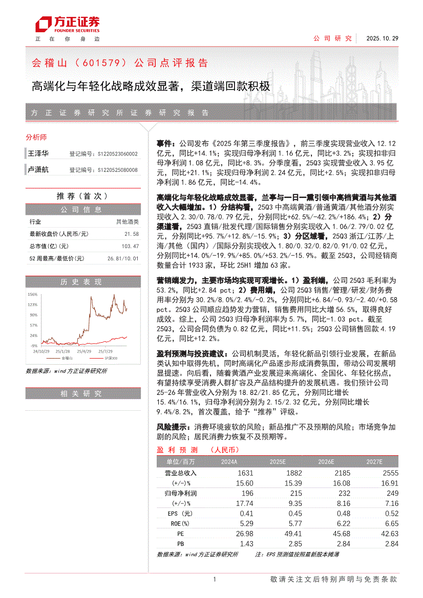 会稽山:方正证券-会稽山-601579-公司点评报告:高端化与年轻化战略成效显著,渠道端回款积极-251029