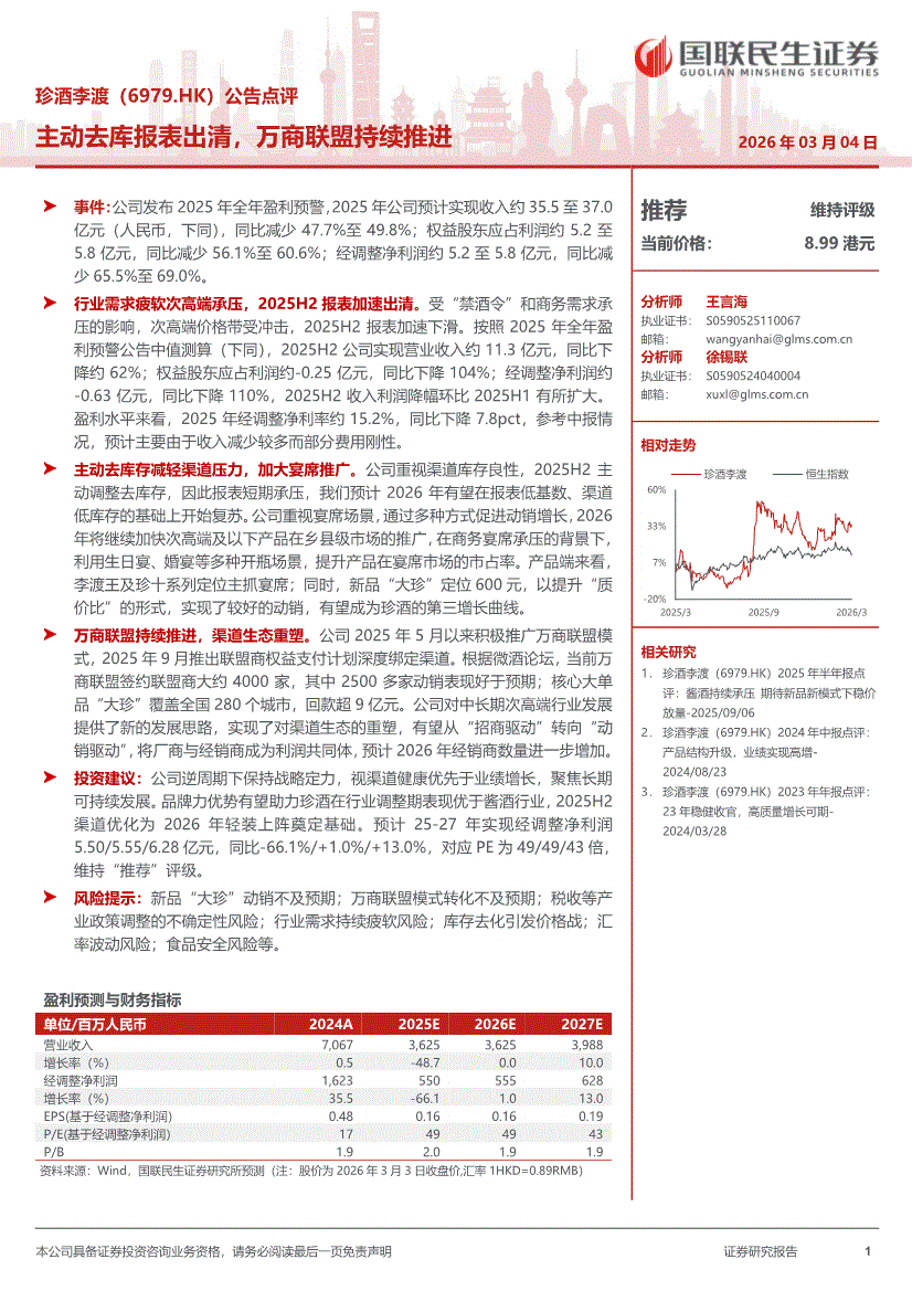 珍酒李渡:国联民生证券-珍酒李渡-6979.HK-公告点评:主动去库报表出清,万商联盟持续推进-260304