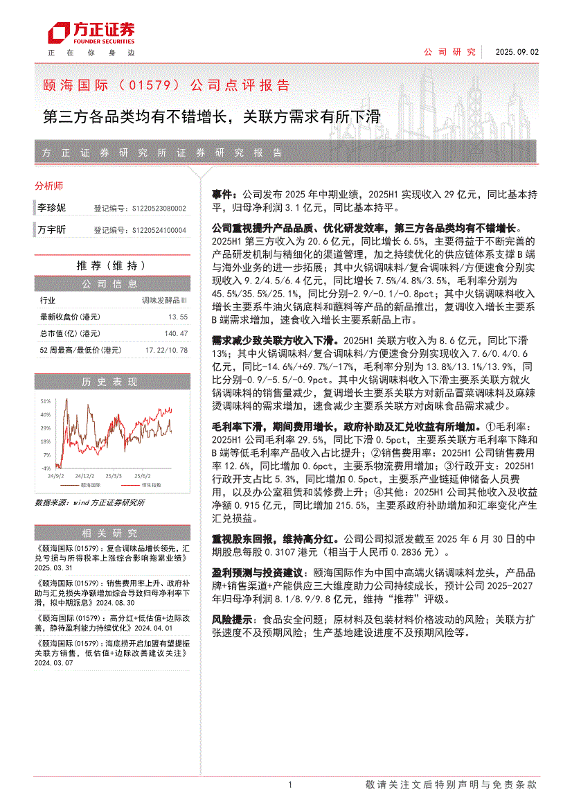 颐海国际:方正证券-颐海国际-1579.HK-公司点评报告:第三方各品类均有不错增长,关联方需求有所下滑-250902