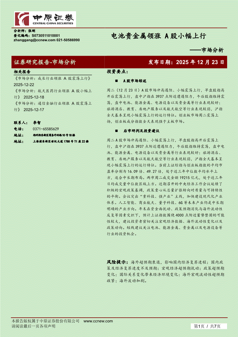 中原证券-市场分析:电池贵金属领涨,A股小幅上行-251223