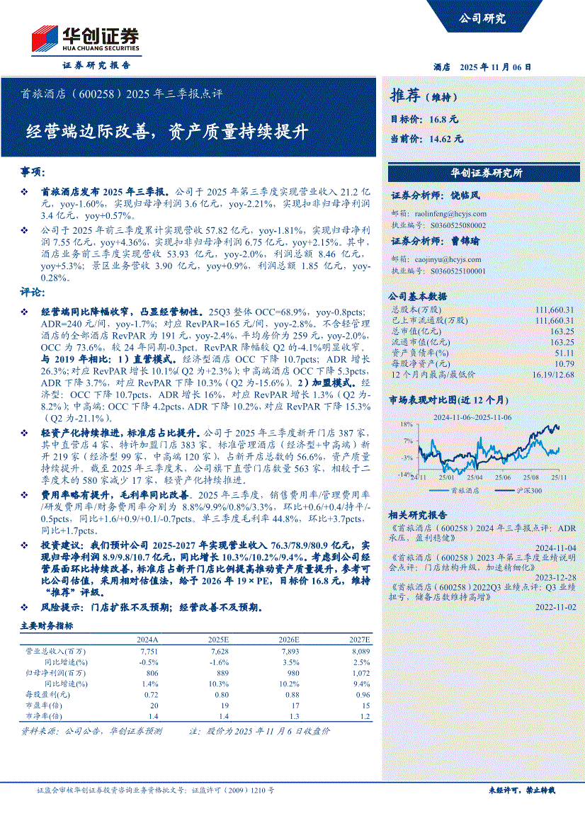 首旅酒店:华创证券-首旅酒店-600258-2025年三季报点评:经营端边际改善,资产质量持续提升-251106