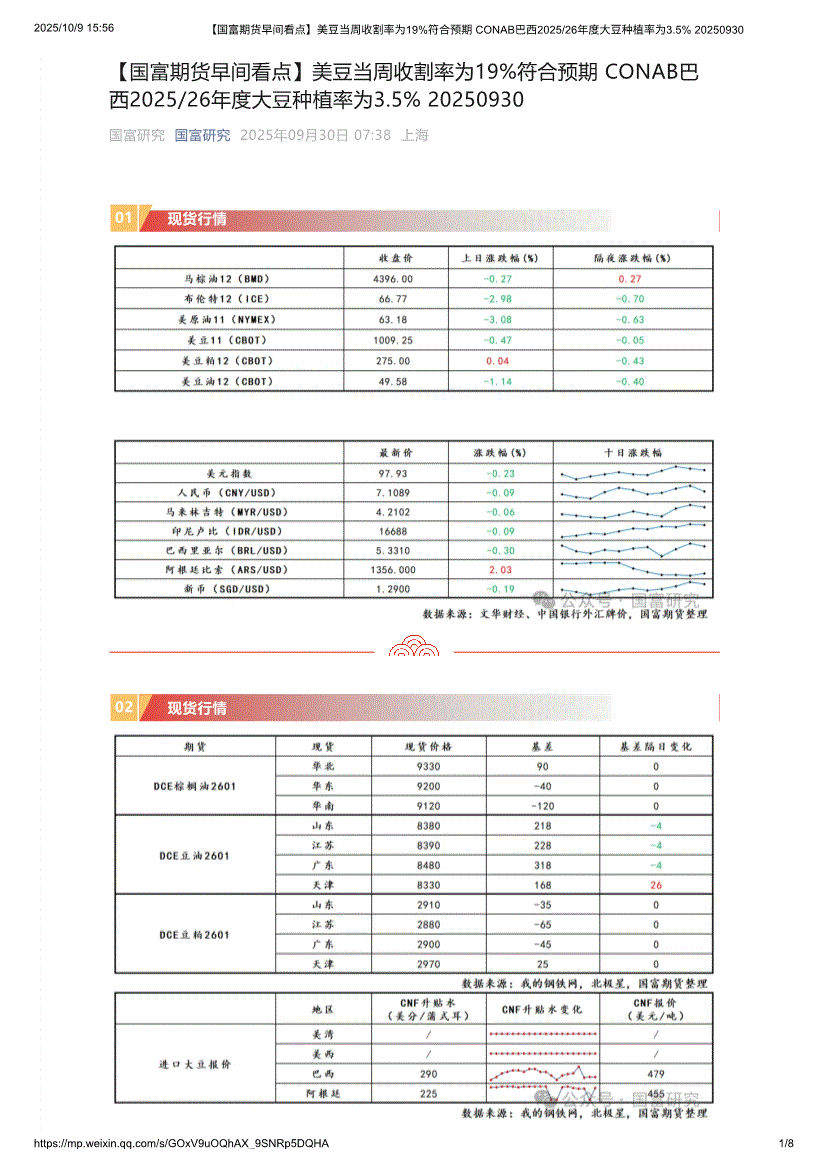 国富期货-【早间看点】美豆当周收割率为19%符合预期,CONAB巴西202526年度大豆种植率为3.5%-251009