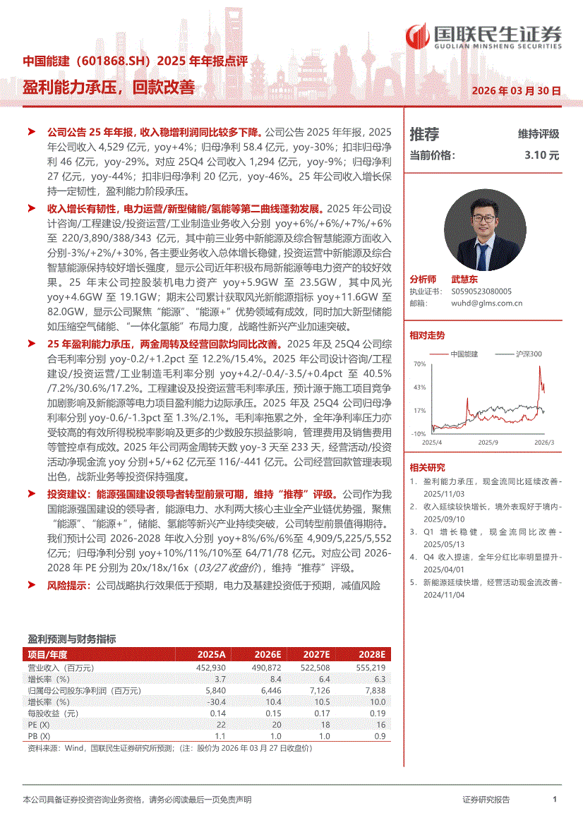 中国能建:国联民生证券-中国能建-601868-2025年年报点评:盈利能力承压,回款改善-260330