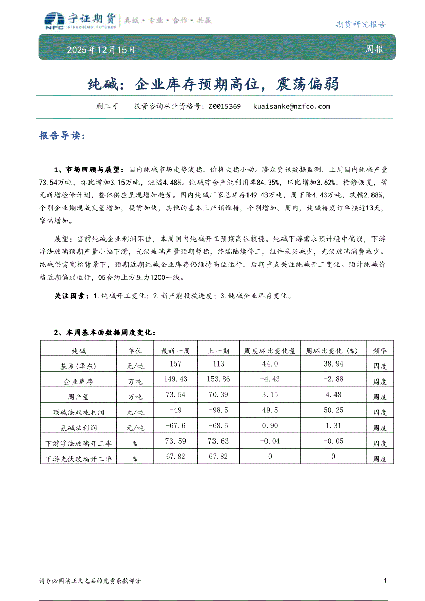 宁证期货-纯碱周报:企业库存预期高位,震荡偏弱-251215