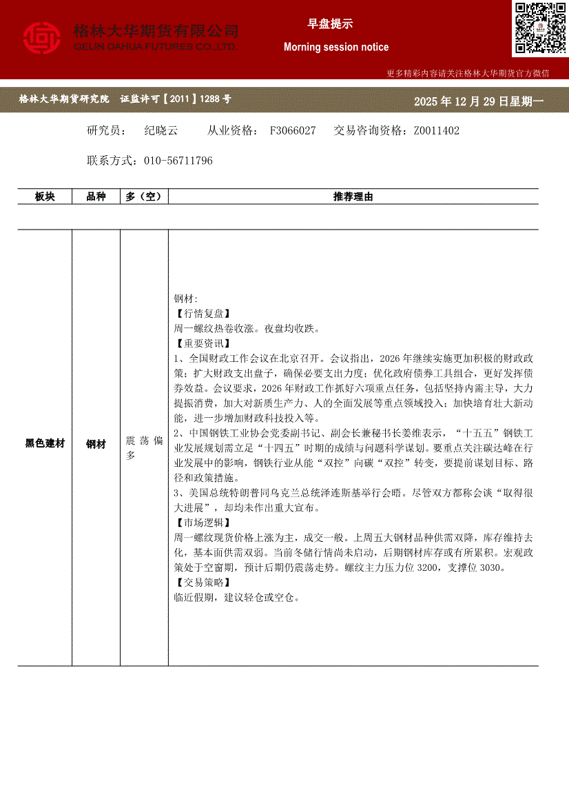 格林大华期货-早盘提示~钢材-251231
