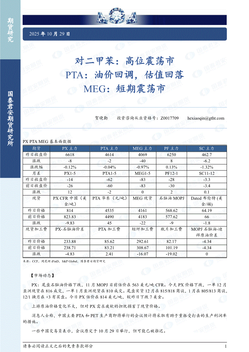 国泰君安期货-对二甲苯:高位震荡市,PTA,油价回调,估值回落,MEG,短期震荡市-251029