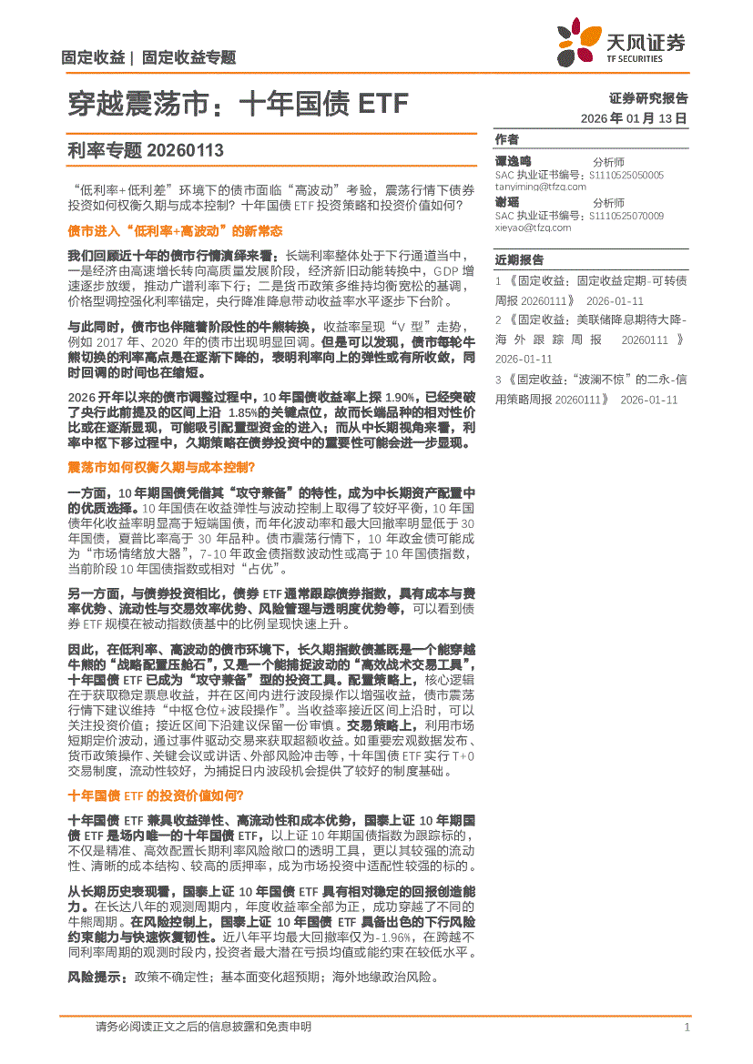 天风证券-利率专题:穿越震荡市,十年国债ETF-260113