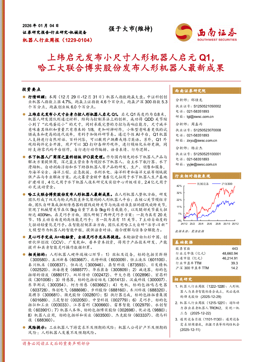 机器人行业:西南证券-机器人行业周报(1229~0104):上纬启元发布小尺寸人形机器人启元Q1,哈工大联合博实股份发布人形机器人最新成果-260104