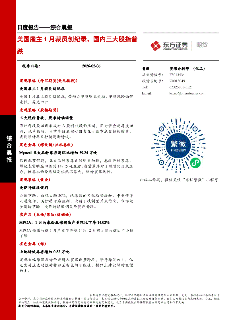 东证期货-综合晨报:美国雇主1月裁员创纪录,国内三大股指普跌-260206