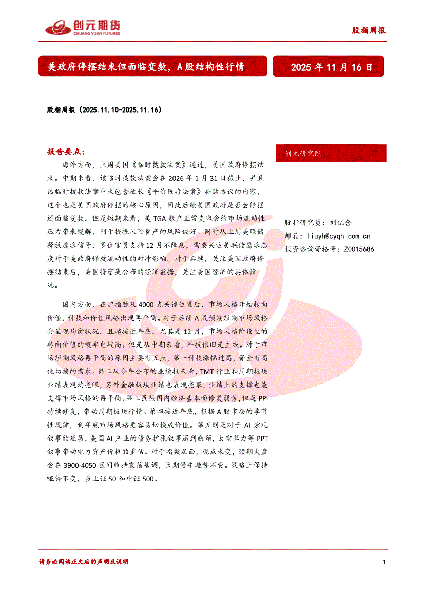 创元期货-股指周报:美政府停摆结束但面临变数,A股结构性行情-251116