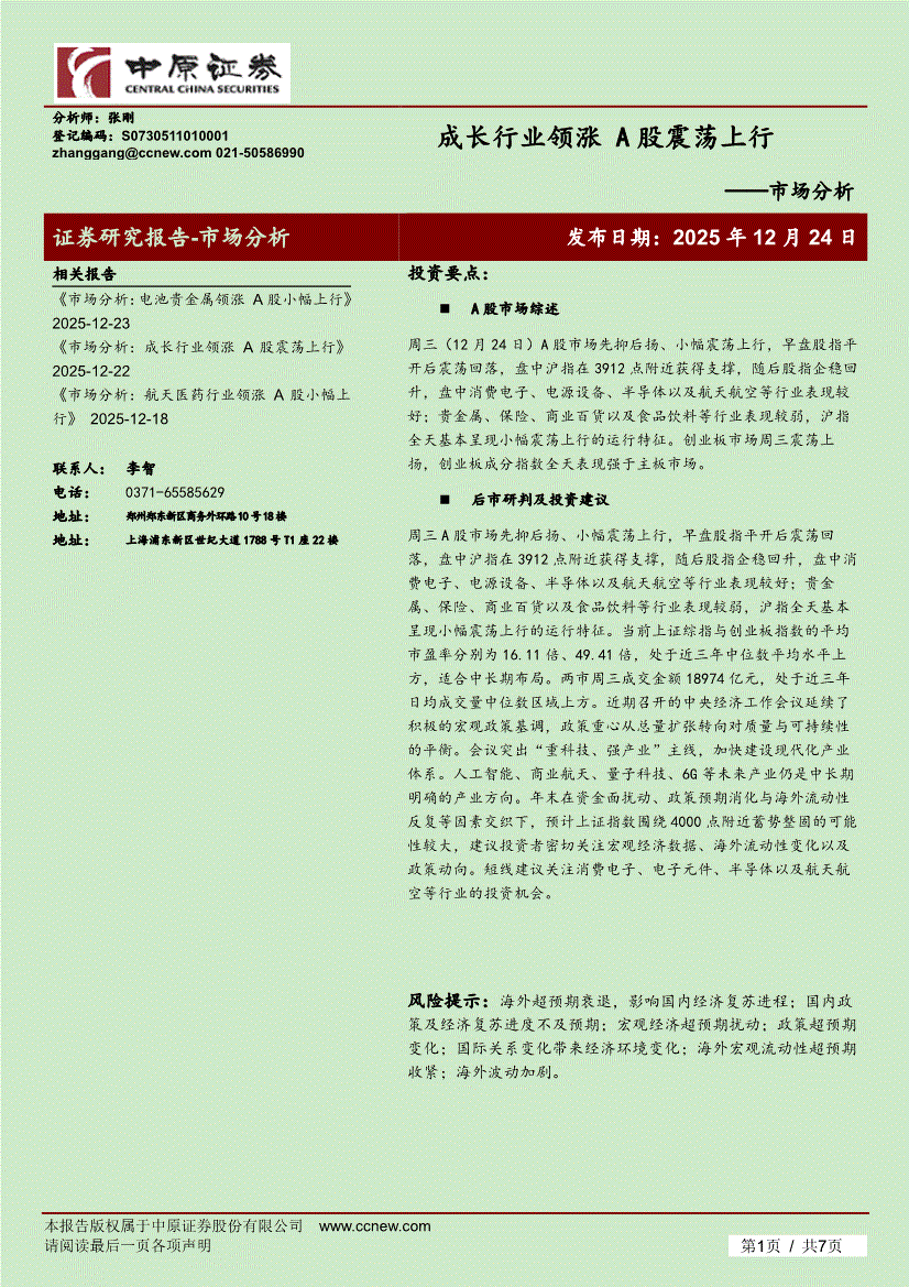 中原证券-市场分析:成长行业领涨,A股震荡上行-251224