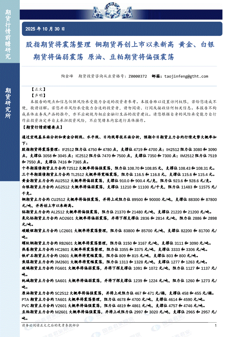国泰君安期货-股指期货将震荡整理铜期货再创上市以来新高黄金、白银期货将偏弱震荡原油、豆粕期货将偏强震荡-251030