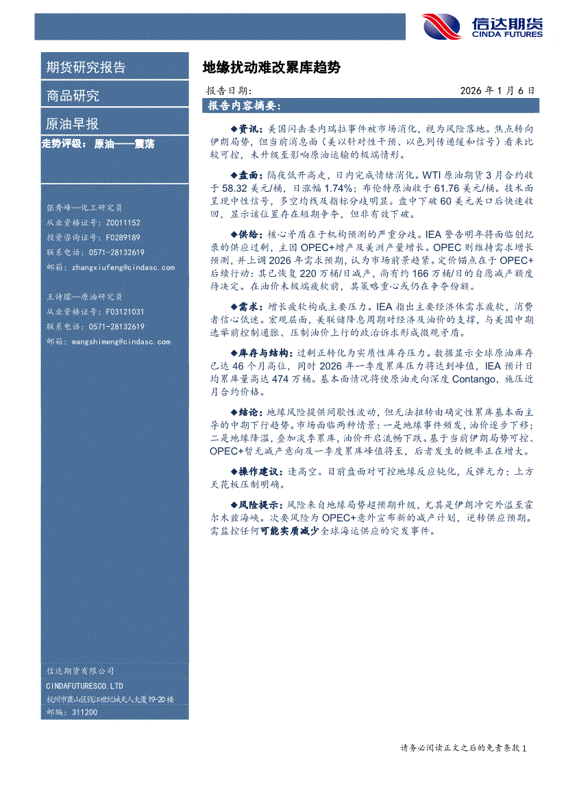 信达期货-原油早报:地缘扰动难改累库趋势-260106