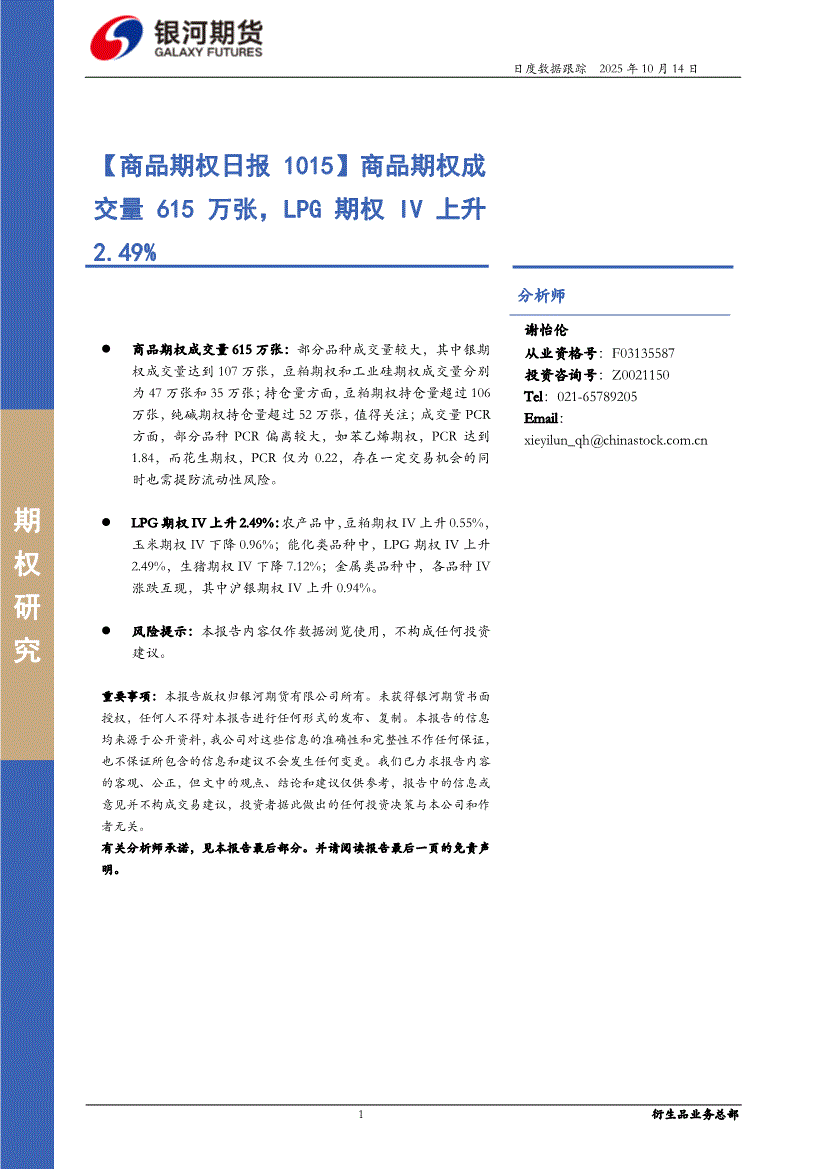 银河期货-商品期权日报:商品期权成交量615万张,LPG期权IV上升2.49%-251014