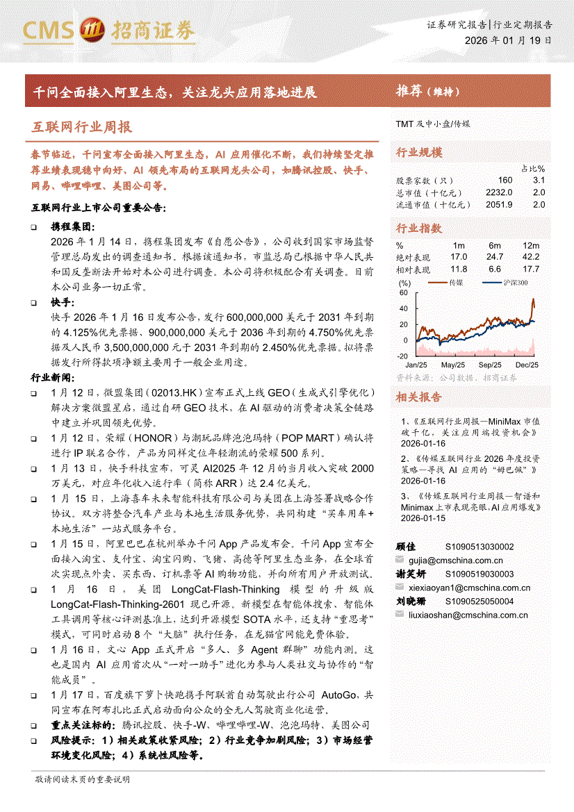 互联网行业:招商证券-互联网行业周报:千问全面接入阿里生态,关注龙头应用落地进展-260119