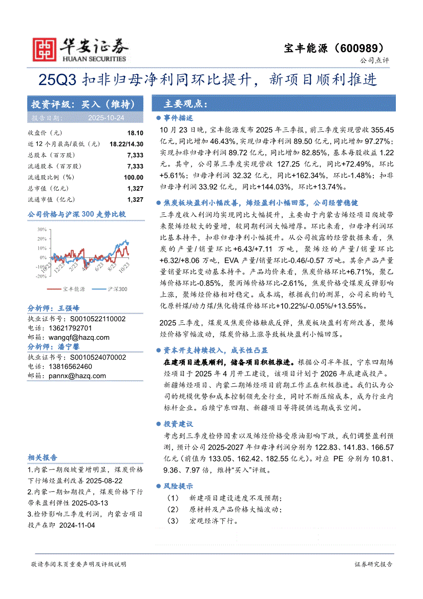 宝丰能源:华安证券-宝丰能源-600989-25Q3扣非归母净利同环比提升,新项目顺利推进-251024