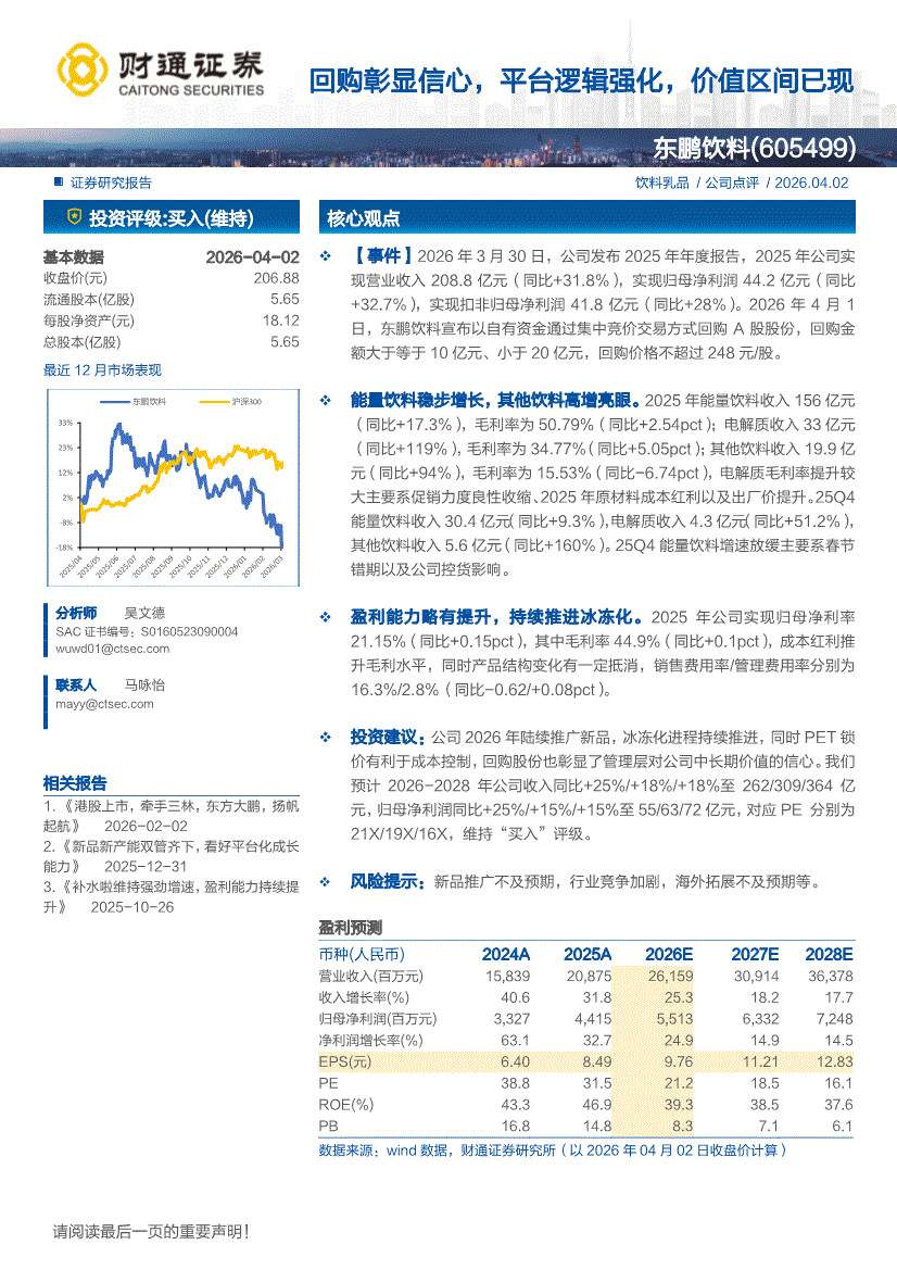东鹏饮料:财通证券-东鹏饮料-605499-回购彰显信心,平台逻辑强化,价值区间已现-260402