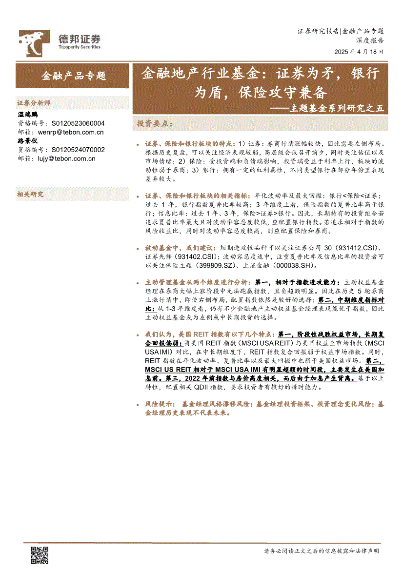德邦证券-主题基金系列研究之五:金融地产行业基金,证券为矛,银行为盾,保险攻守兼备-250418