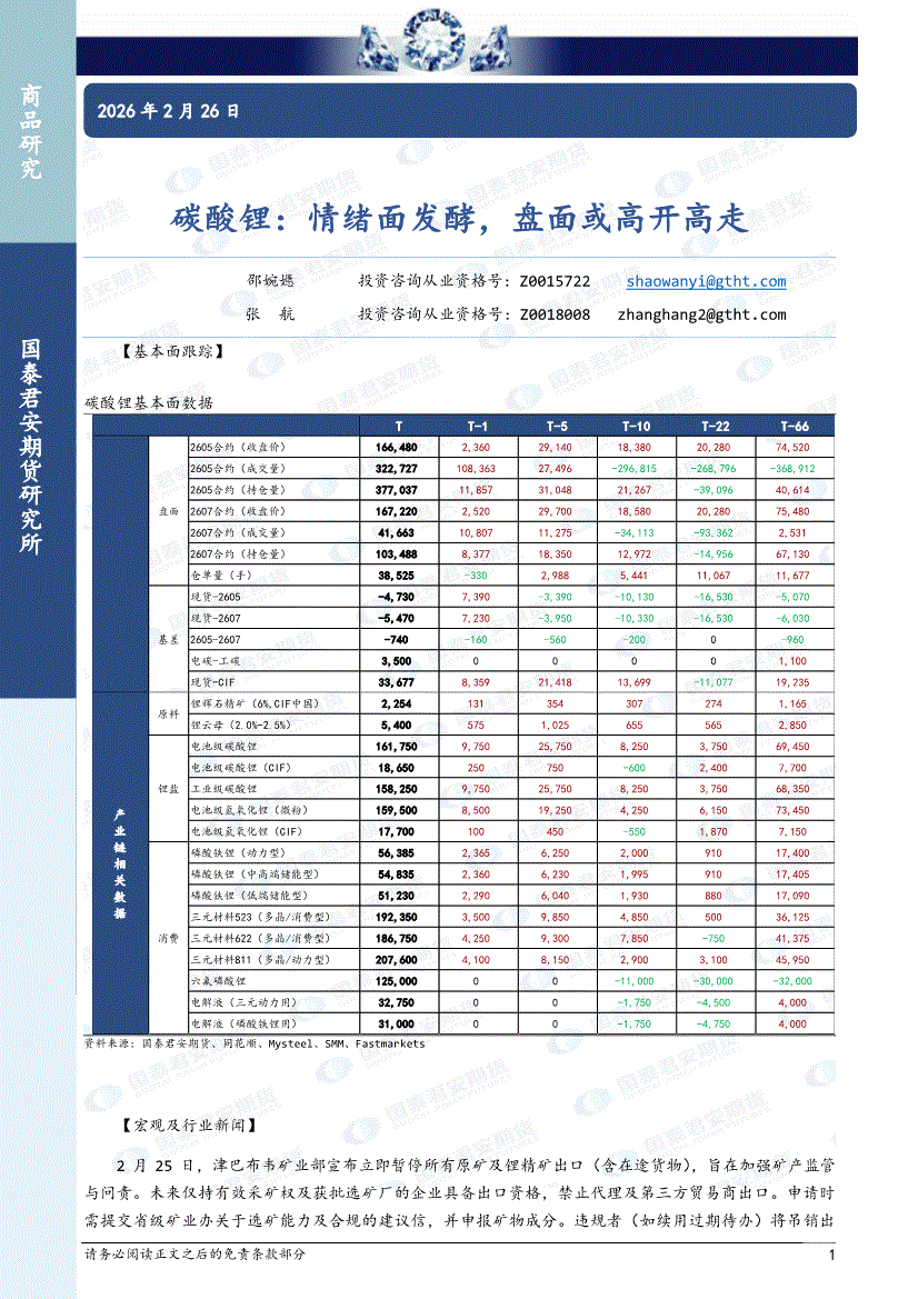国泰君安期货-碳酸锂:情绪面发酵,盘面或高开高走-260226