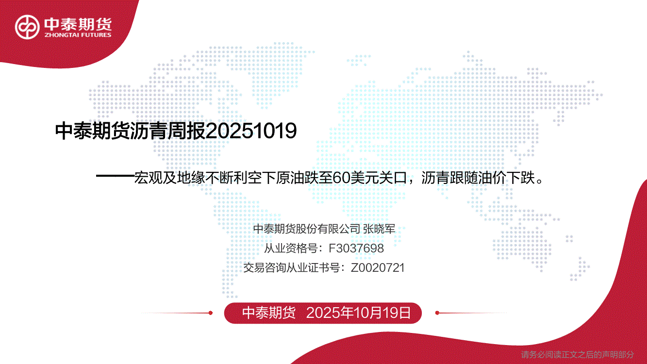 中泰期货-沥青周报:宏观及地缘不断利空下原油跌至60美元关口,沥青跟随油价下跌-251019
