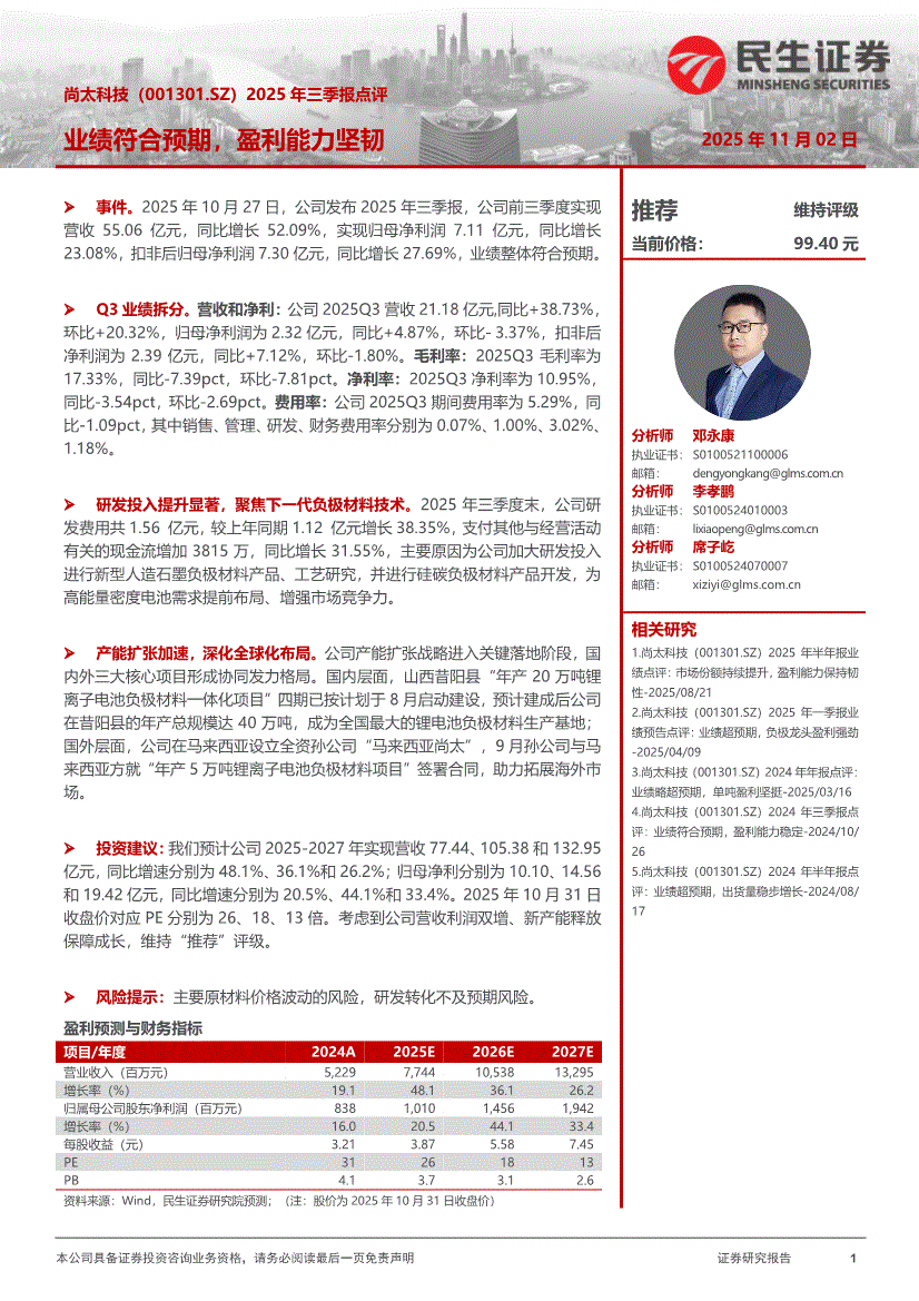 尚太科技:民生证券-尚太科技-001301-2025年三季报点评:业绩符合预期,盈利能力坚韧-251102
