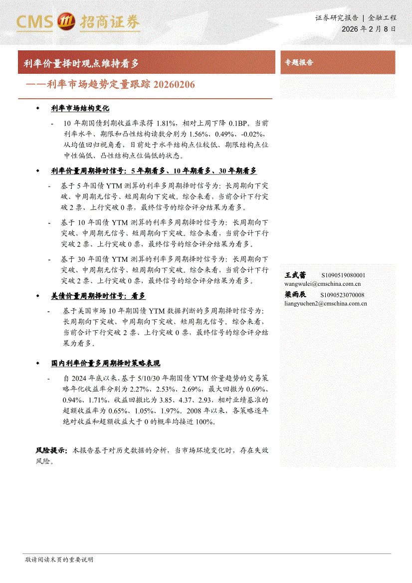 招商证券-利率市场趋势定量跟踪:利率价量择时观点维持看多-260208