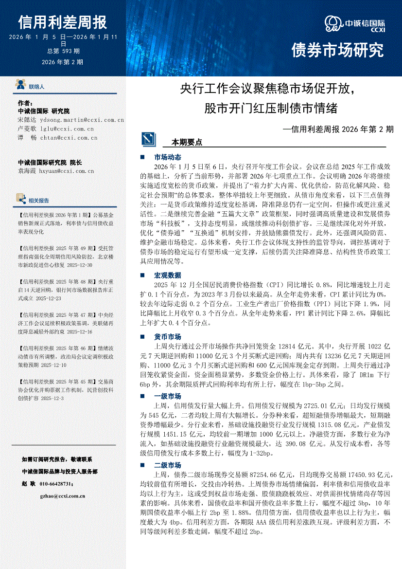 中诚信国际-信用利差周报2026年第2期:央行工作会议聚焦稳市场促开放,股市开门红压制债市情绪-260111