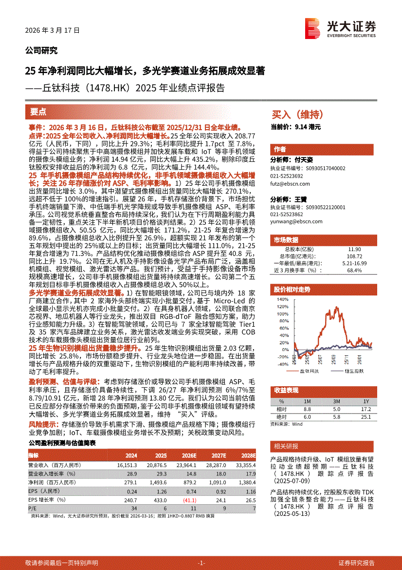 丘钛科技:光大证券-丘钛科技-1478.HK-2025年业绩点评报告:25年净利润同比大幅增长,多光学赛道业务拓展成效显著-260317