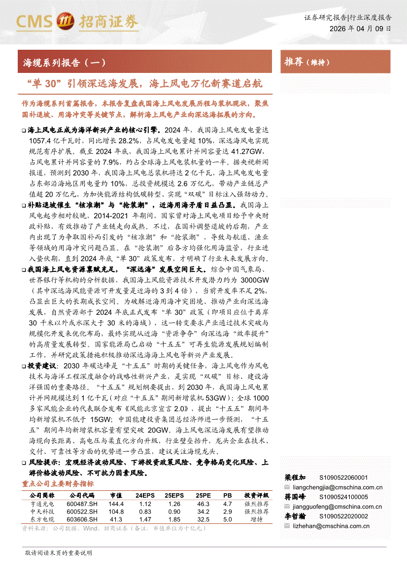 海上风电行业:招商证券-海上风电行业海缆系列报告(一):“单30”引领深远海发展,海上风电万亿新赛道启航-260409