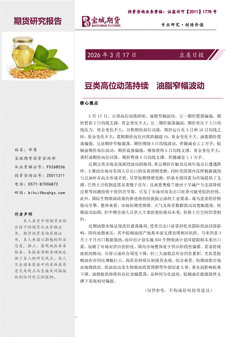 宝城期货-豆类日报:豆类高位动荡持续,油脂窄幅波动-260317