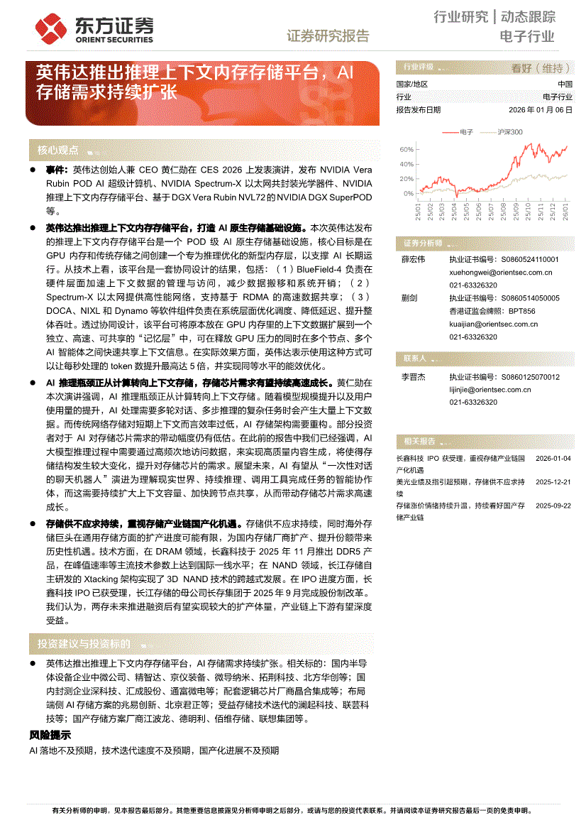 电子行业:东方证券-电子行业:英伟达推出推理上下文内存存储平台,AI存储需求持续扩张-260106