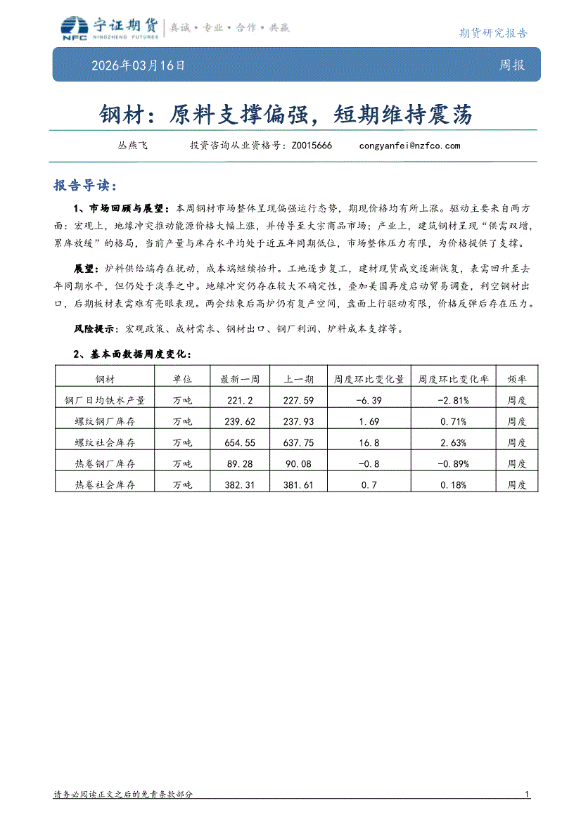 宁证期货-钢材周报:原料支撑偏强,短期维持震荡-260316