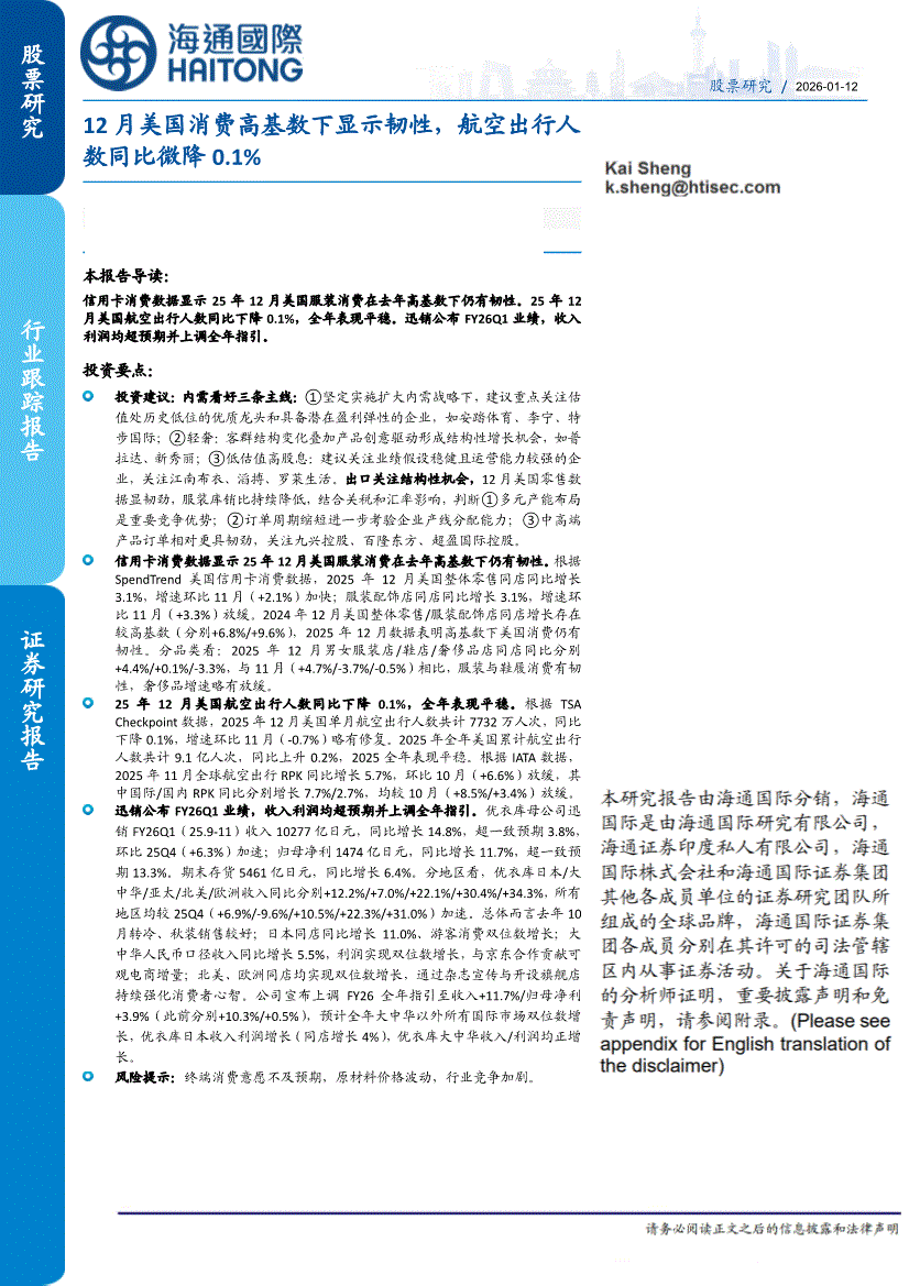 纺织服饰行业:海通国际-纺织服饰行业:12月美国消费高基数下显示韧性,航空出行人数同比微降0.1%-260112