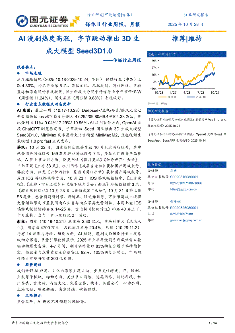 传媒行业:国元证券-传媒行业周报:AI漫剧热度高涨,字节跳动推出3D生成大模型Seed3D1.0-251028