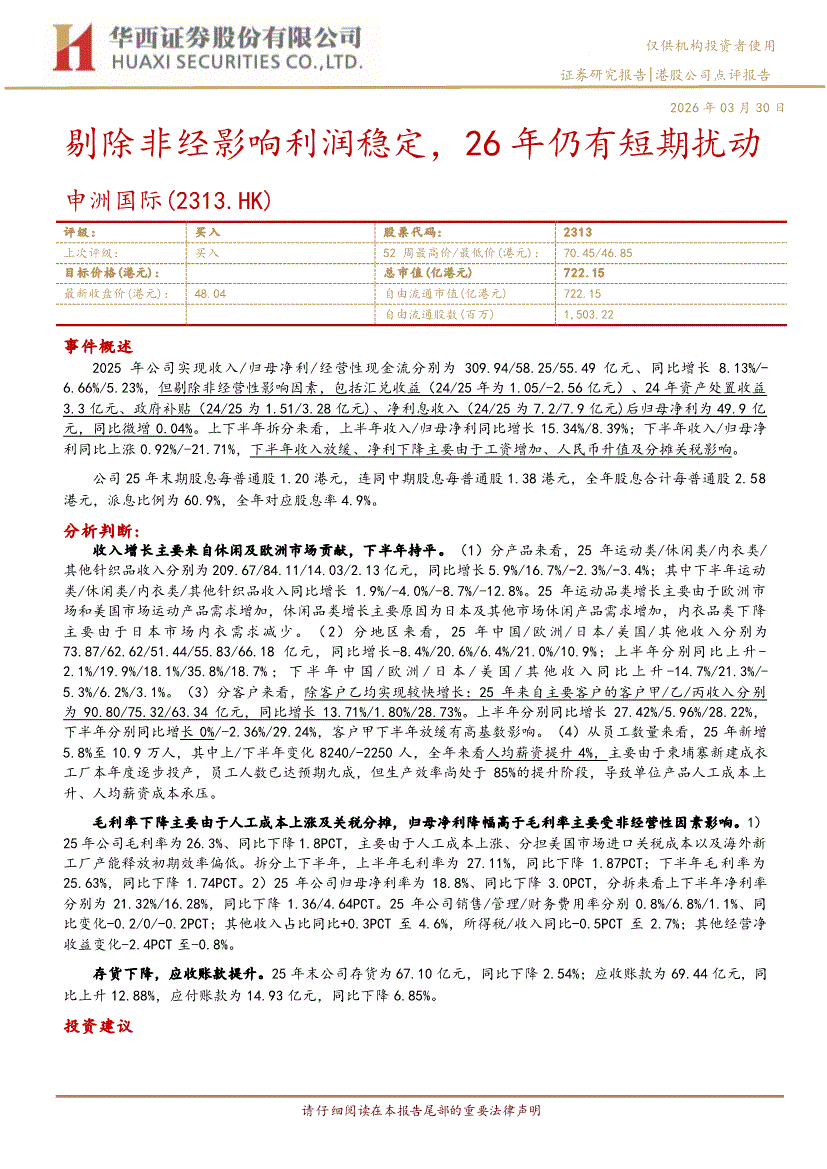 申洲国际:华西证券-申洲国际-2313.HK-剔除非经影响利润稳定,26年仍有短期扰动-260330