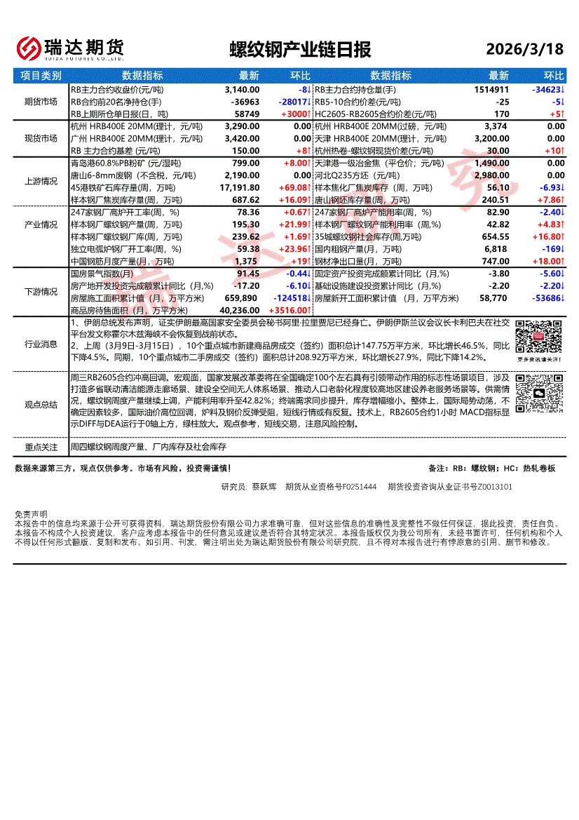 瑞达期货-螺纹钢产业链日报-260318