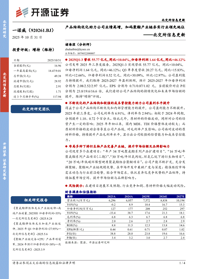 一诺威:开源证券-一诺威-920261-北交所信息更新:产品结构优化助力公司业绩高增,加码聚酯产业链夯实行业领先地位-251031