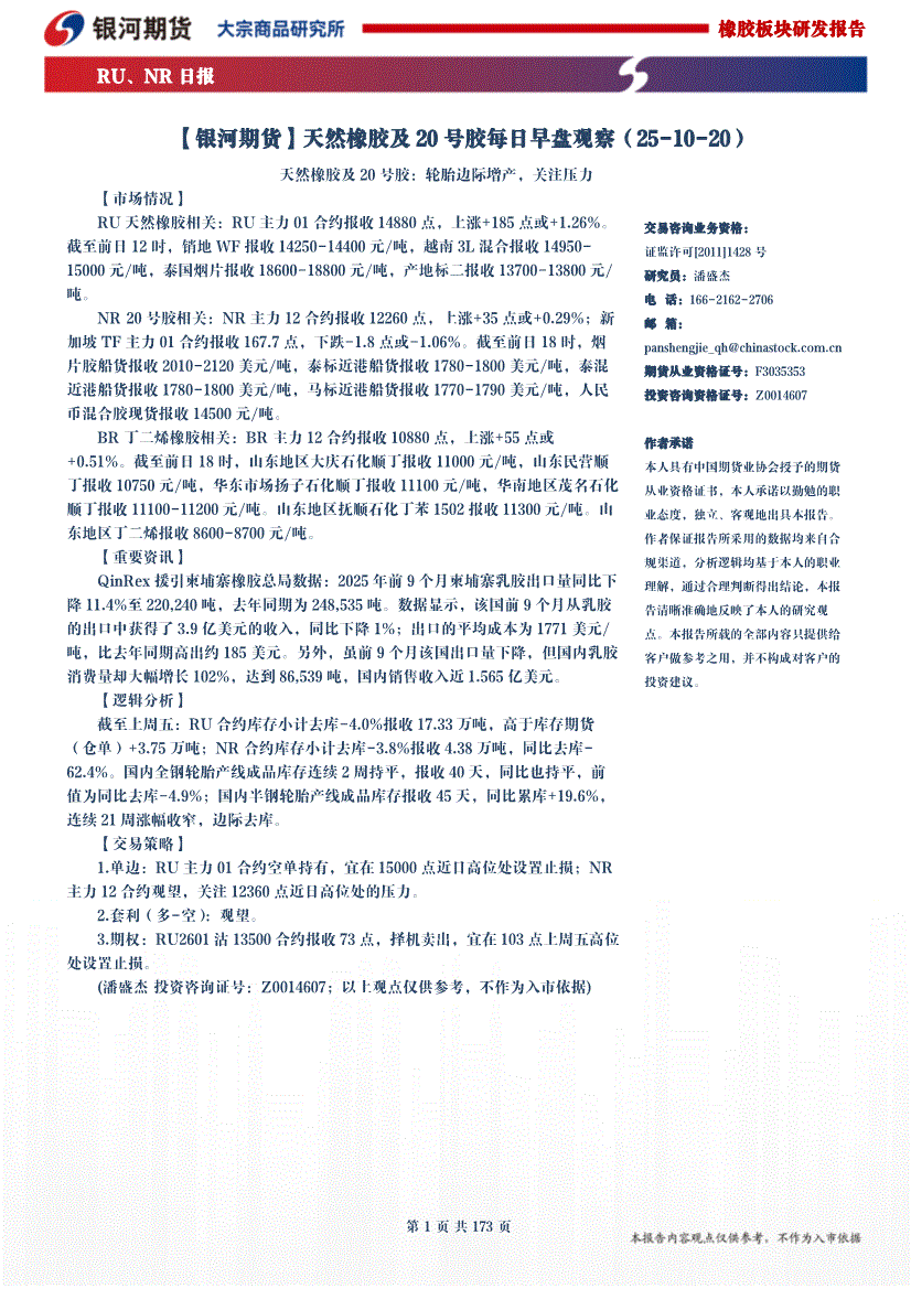 银河期货-天然橡胶及20号胶每日早盘观察-251020